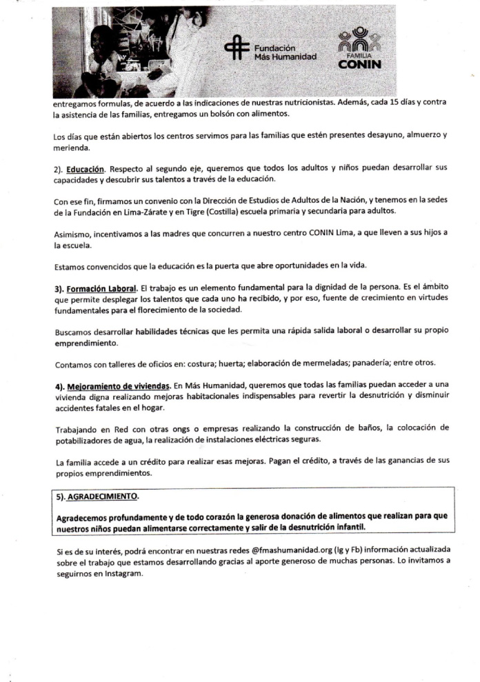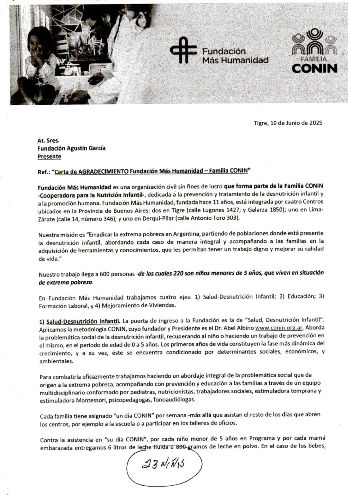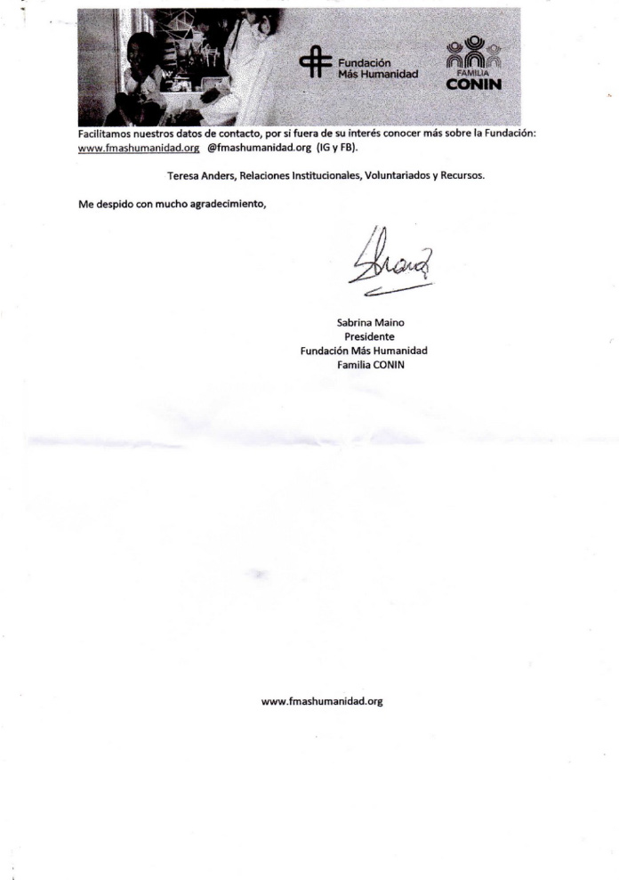 Desde hace varios años la fundación Mas Humanidad – Conin recibe mensualmente de parte de la fundación alimentos secos, aquí una nota de agradecimiento.